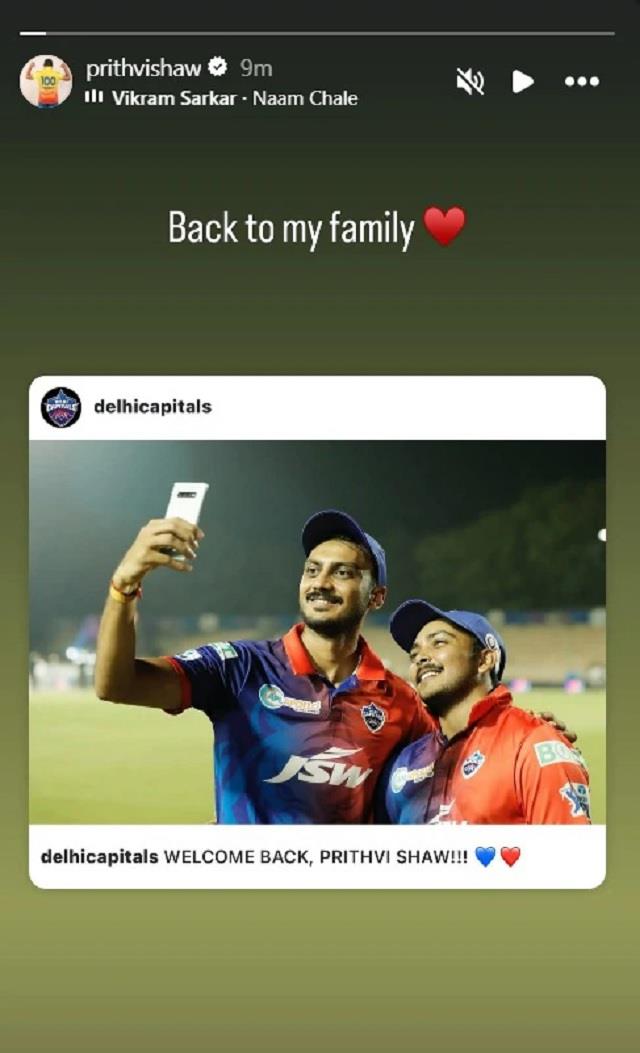 नीलामी के तुरंत बाद पृथ्वी शॉ ने इंस्टाग्राम स्टोरी के जरिए अपनी प्रतिक्रिया दी। उन्होंने एक छोटी लेकिन भावनात्मक लाइन लिखी “अपने परिवार में वापस।” यह संदेश साफ दिखाता है कि DC के साथ उनका रिश्ता सिर्फ एक कॉन्ट्रैक्ट तक सीमित नहीं है, बल्कि भावनात्मक जुड़ाव भी उतना ही गहरा रहा है।