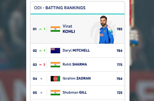 कोहली ने न्यूजीलैंड के खिलाफ सीरीज के पहले मैच में 93 रन बनाए थे जिससे लिस्ट में उनकी पोजिशन नंबर 2 से 1 पर आ गई। वह इस फॉर्मेट में शानदार रहे हैं और 2027 वनडे वर्ल्ड कप के लिए अपनी जगह पक्की करने पर लगे हैं। दूसरी ओर, रोहित ने सीरीज के पहले मैच में 26 रन बनाए और उसके बाद वह तीसरे नंबर पर खिसक गए। रोहित के निचे खिसकने का एक कारण डेरिल मिशेल का शानदार प्रदर्शन भी रहा जिससे वह लिस्ट में दूसरे नंबर पर आ गए। डेरिल ने 84 रन बनाए थे जिससे न्यूजीलैंड पहले वनडे में 300 के स्कोर पर पहुंचा था।